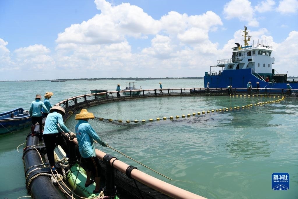 5月27日,在湛江市徐聞縣西連鎮(zhèn),漁業(yè)工人從徐聞國(guó)橋深海養(yǎng)殖有限公司的金鯧魚(yú)深海網(wǎng)箱捕魚(yú)(無(wú)人機(jī)照片)。