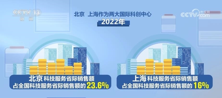 從創(chuàng)新來(lái)看,2017年—2022年,全國(guó)科技服務(wù)省際銷售額年均增長(zhǎng)28%,較科技服務(wù)總體銷售收入增速快4.2個(gè)百分點(diǎn)。今年截至5月20日,科技服務(wù)省際銷售額同比增長(zhǎng)29.7%,較科技服務(wù)總體銷售收入增速快2.6個(gè)百分點(diǎn)。北京、上海作為兩大國(guó)際科創(chuàng)中心,2022年科技服務(wù)省際銷售額分別占全國(guó)科技服務(wù)省際銷售額的23.6%和16%;2017年—2022年年均分別增長(zhǎng)22.1%和24.2%。