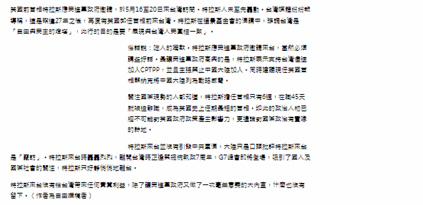這兩天,譚主發(fā)現(xiàn)臺灣中時新聞網(wǎng)刊發(fā)了一篇快評文章:《特拉斯悄悄走了》。文章說到:特拉斯來臺沒有給臺灣帶來任何實質(zhì)利益,除了讓民進黨當(dāng)局又做了一次毫無意義的大內(nèi)宣,什么也沒有留下。