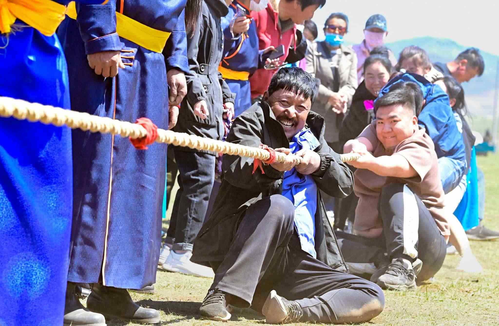 2023年5月26日,內(nèi)蒙古興安盟,科爾沁右翼前旗德伯斯鎮(zhèn)阿日林一合嘎查舉行首屆那達(dá)慕,設(shè)置的賽馬、布魯、搏克、拔河等傳統(tǒng)體育娛樂(lè)項(xiàng)目,吸引嘎查周邊500余名牧民參加比賽,喜慶牧業(yè)豐收季。視覺(jué)中國(guó)