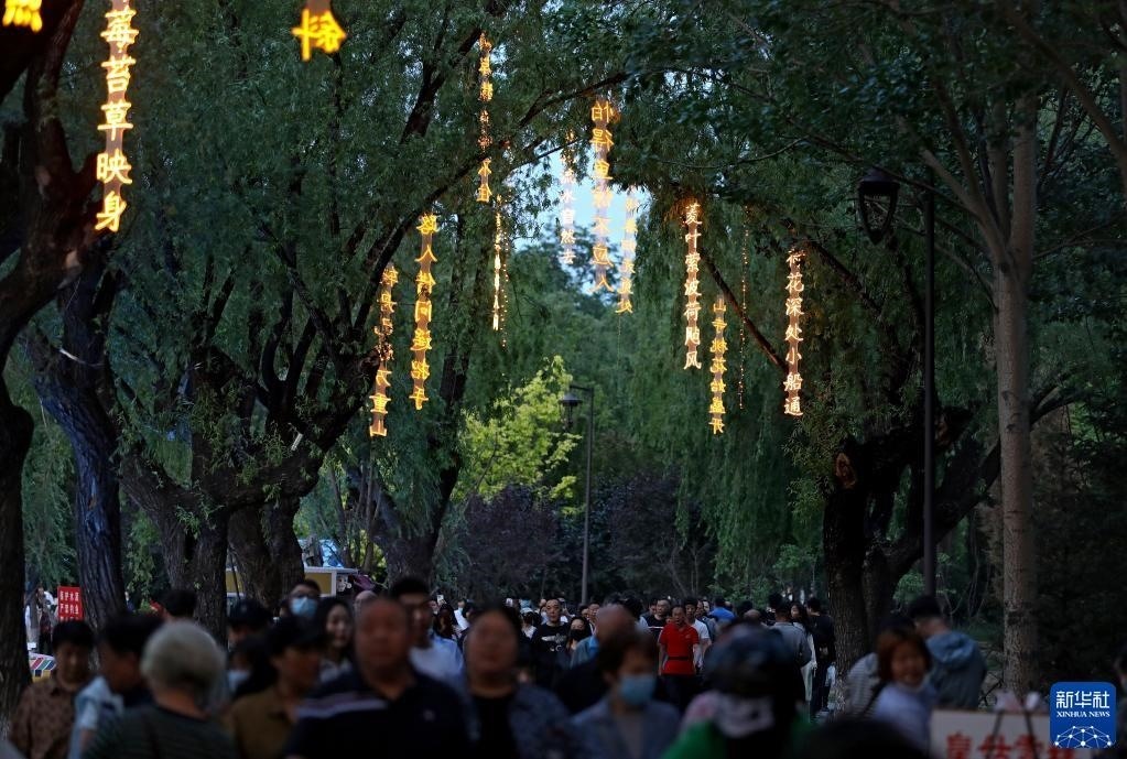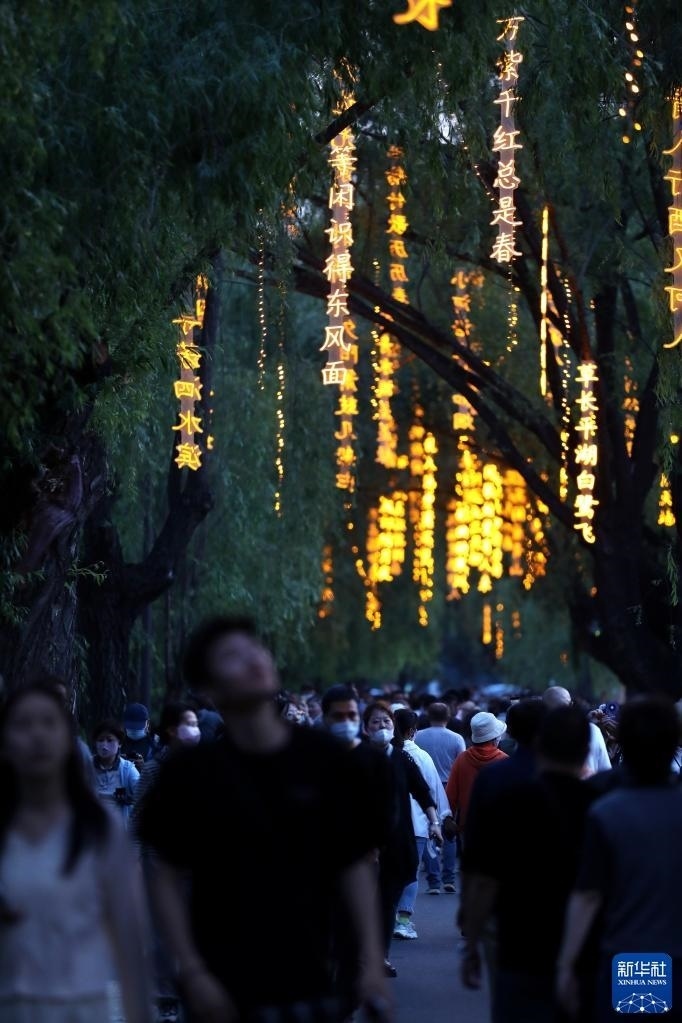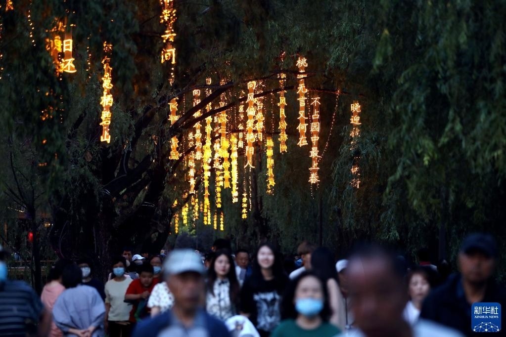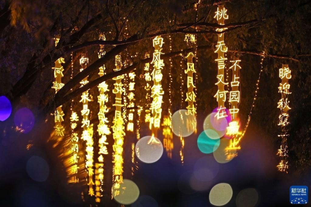 近日,沈陽市萬泉公園打造的一條詩詞漫道成為游客和市民的網(wǎng)紅打卡地。每當夜幕降臨,幾十首古詩詞彩燈在這條300余米道路的樹梢枝頭熠熠閃爍,以詩入景,一步一詩。新華社記者 姚劍鋒 攝