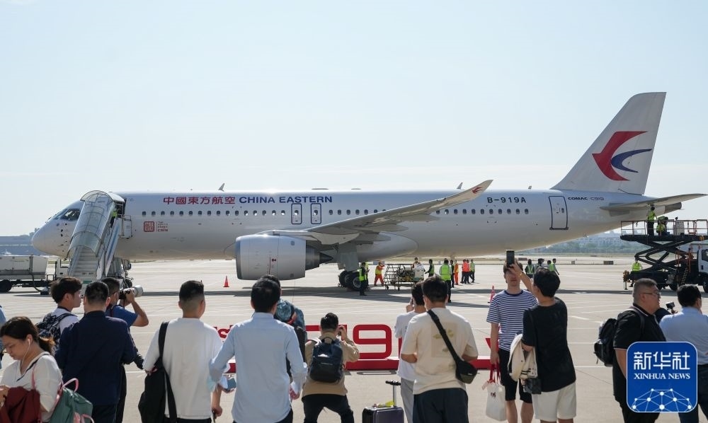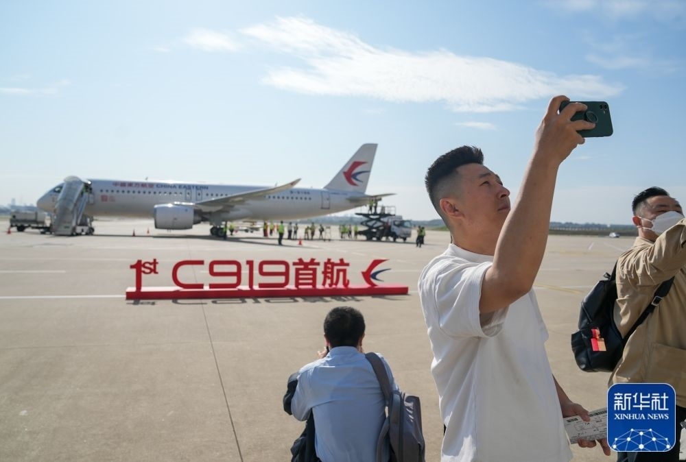 5月28日,旅客與即將首航的C919飛機合影。新華社記者丁汀攝