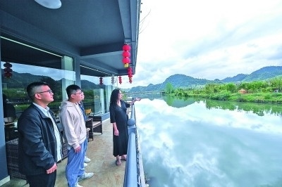 在浙江杭州臨安區(qū)昌化鎮(zhèn)白牛村,村落景區(qū)投資運(yùn)營商羅星玥(右一)向游客介紹白牛村的自然風(fēng)光。新華社發(fā)