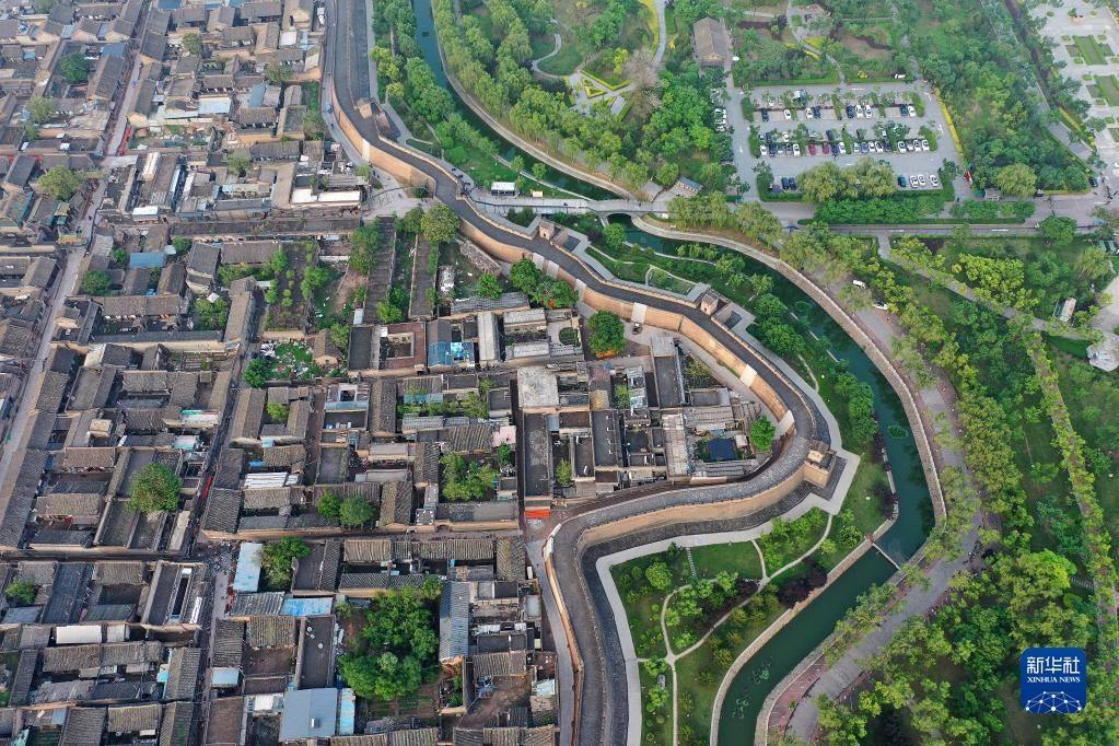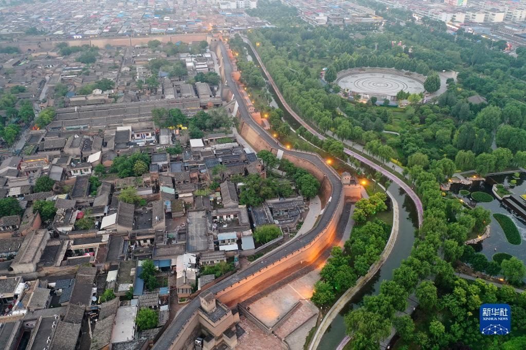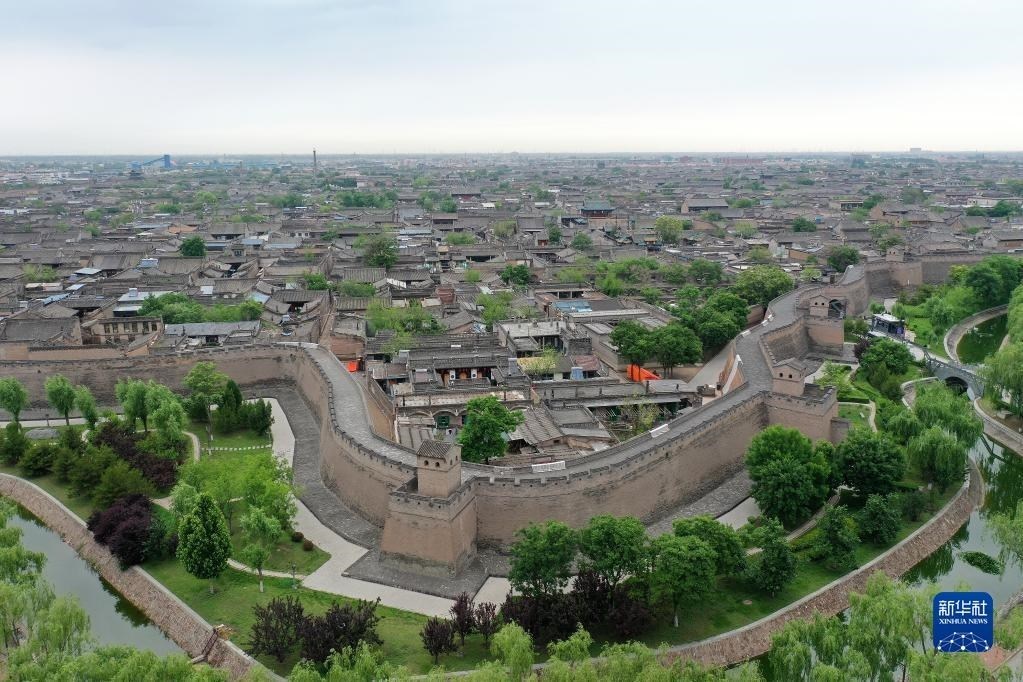 游客在平遙古城城墻上游覽(5月30日攝,無人機照片)。