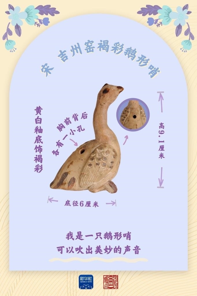 鵝形哨出土于江西吉安的宋代吉州窯遺址。吉安市博物館館長李希朗說,吉州窯的瓷土粗松,有近似于陶的特點,可塑性較強。這里出土的瓷塑大多不超過10厘米,動物瓷塑的原型多為社會生活中所常見。從出土的瓷塑數(shù)量來看,吉州窯當年的訂單量很大,頗受市場歡迎。也許每一只鵝形哨的背后,都有一名鼓著腮幫子的稚童。歷經(jīng)時光荏苒,鵝形哨到今天還能發(fā)出動聽的哨音。