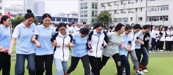 在四川廣漢中學(xué),一場(chǎng)專門針對(duì)高三學(xué)子的趣味接力賽正在開展。同學(xué)們?cè)谕瓿少惻?、跳繩等項(xiàng)目的同時(shí),需要團(tuán)隊(duì)協(xié)作完成顛網(wǎng)球、射門等項(xiàng)目。