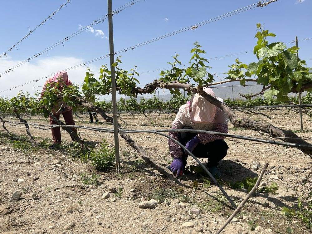 寧夏志輝原石酒莊的葡萄園里,昊苑村的村民們?cè)谀ㄑ?。新華社記者艾福梅 攝