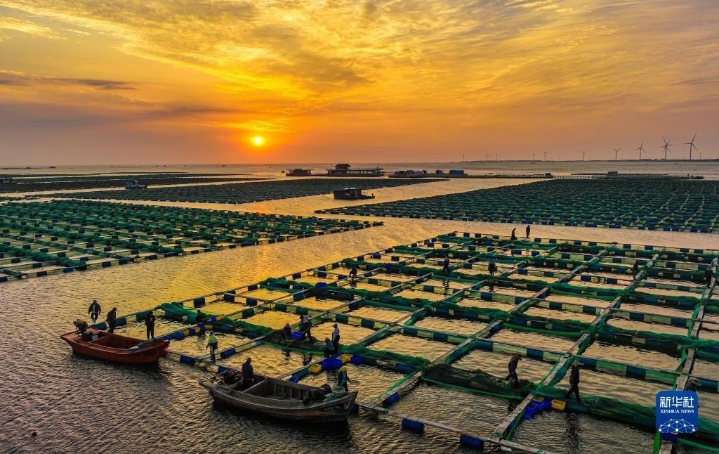6月5日拍攝的朝霞映襯下的榮成市石島管理區(qū)桑溝灣海洋牧場生態(tài)網(wǎng)箱養(yǎng)殖區(qū)(無人機(jī)照片)。
