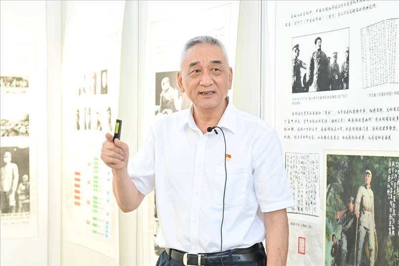 會(huì)后,領(lǐng)導(dǎo)嘉賓觀看“背負(fù)民族希望—紀(jì)念新四軍成立86周年回顧展”,張曉龍現(xiàn)場(chǎng)給大家講述新四軍的歷史沿革和征戰(zhàn)歷程。