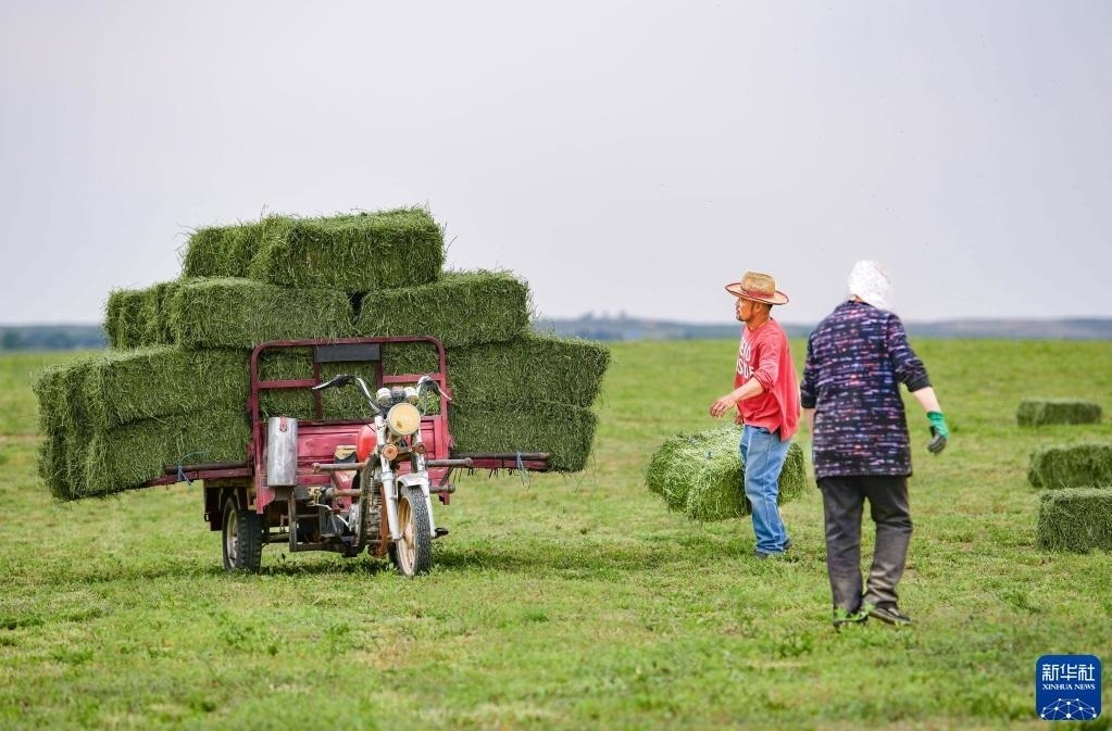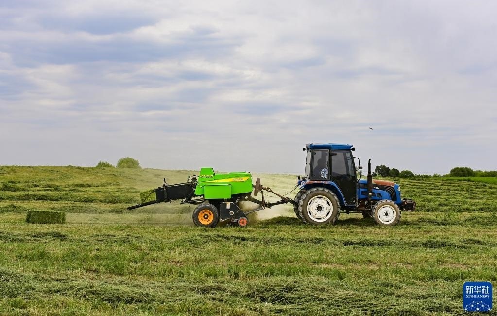 進(jìn)入6月,內(nèi)蒙古自治區(qū)鄂爾多斯市鄂托克前旗大面積種植的紫花苜蓿進(jìn)入了成熟收獲期,當(dāng)?shù)胤N植戶搶抓晴好天氣展開(kāi)收割,確保穩(wěn)產(chǎn)豐收。近年來(lái),該旗借助高效節(jié)水技術(shù),持續(xù)打造優(yōu)質(zhì)牧草基地,種植紫花苜蓿、燕麥草等牧草品種,每年加工干草和青貯飼料超過(guò)80萬(wàn)噸,除供應(yīng)當(dāng)?shù)仞B(yǎng)殖企業(yè)外還銷往內(nèi)蒙古各地,帶動(dòng)了種植戶增收。   新華社發(fā)(王正攝)