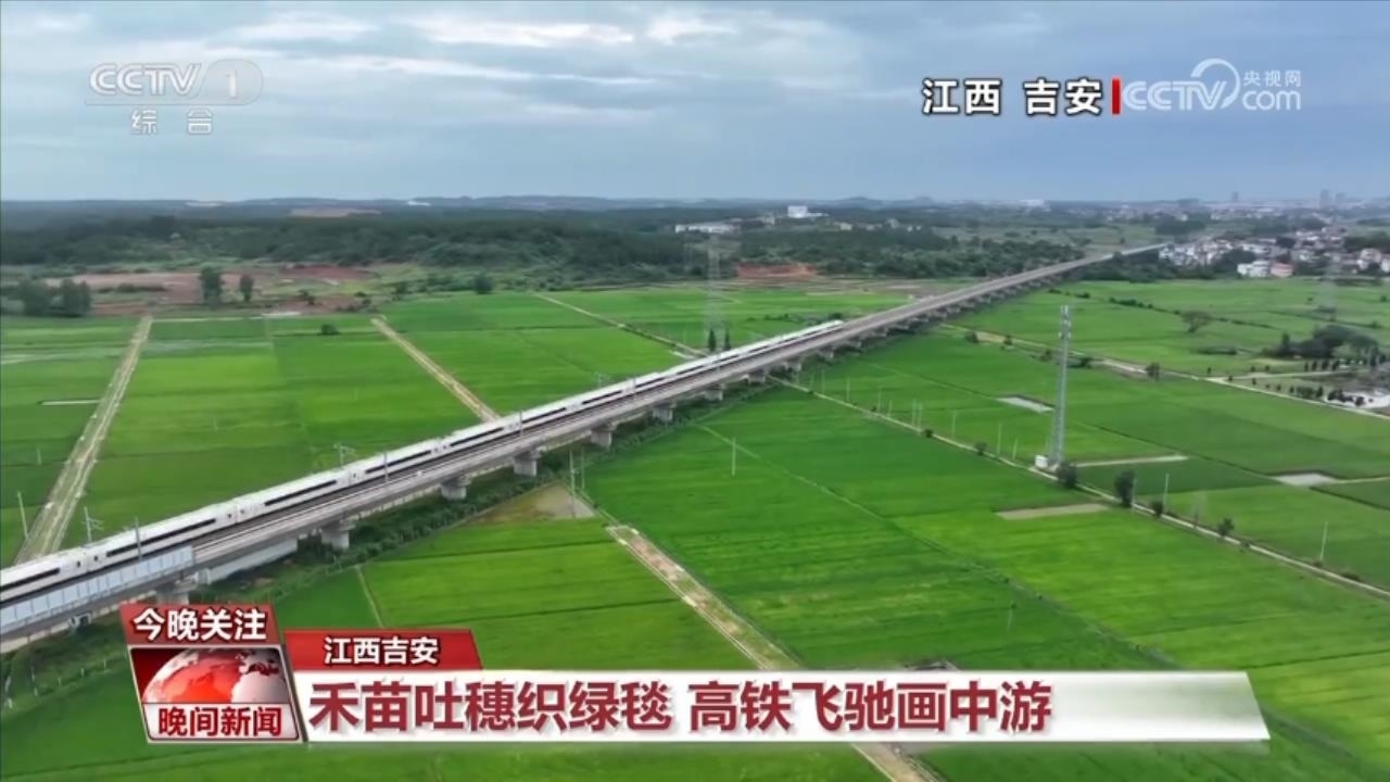 跟隨疾馳的高鐵,飛至江西吉安這片稻田的上空。早早種下的水稻,已經(jīng)進入抽穗期。飛馳的高鐵從一塊塊綠毯中呼嘯而過,驚起層層稻浪。這是工業(yè)與農業(yè)的交響,這是快與慢的彼此致敬。再過二十多天,這片綠色的田野,將回饋黃澄澄、沉甸甸的稻谷。