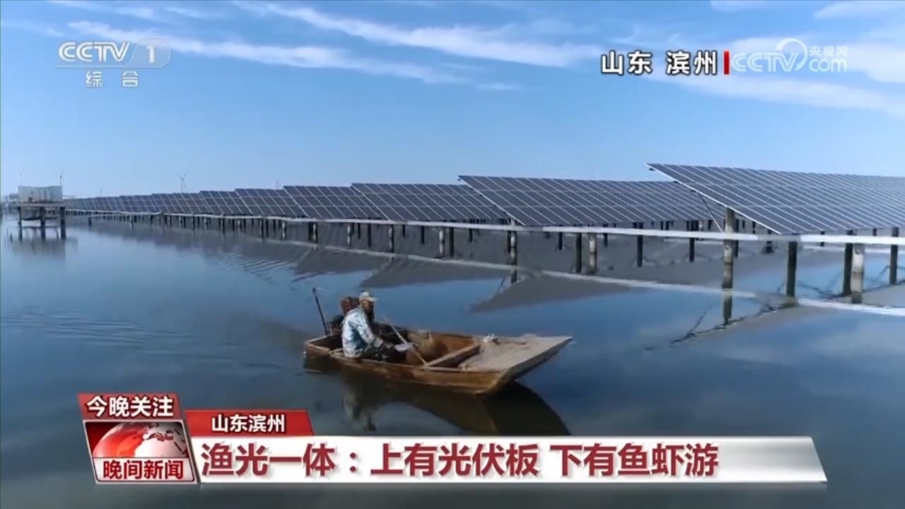 我們現(xiàn)在從陸地轉向水域,在山東濱州沾化的這個鹽田蝦養(yǎng)殖區(qū)里,蝦池上方是藍色光伏板,25度傾斜角的設計,既能達到最佳發(fā)電效果,又能為蝦池遮光、降溫。光伏矩陣下,漁民撐一葉小舟為蝦苗投喂餌料。每年,2000萬尾鹽田蝦從這里游上全國餐桌,近4億度清潔綠電并入電網(wǎng)。養(yǎng)殖業(yè)牽手新能源,奏出新時代的漁光曲。