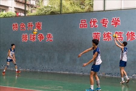 隨著下課鈴聲響起,學(xué)生們紛紛跑到操場(chǎng)上活動(dòng)。操場(chǎng)一側(cè)是學(xué)校的排球訓(xùn)練館,二十幾名排球少年正在這里揮汗如雨地進(jìn)行著每天的排球訓(xùn)練。目前,該校男排隊(duì)有8名隊(duì)員入選本屆四川省青年男排集訓(xùn)隊(duì)。
