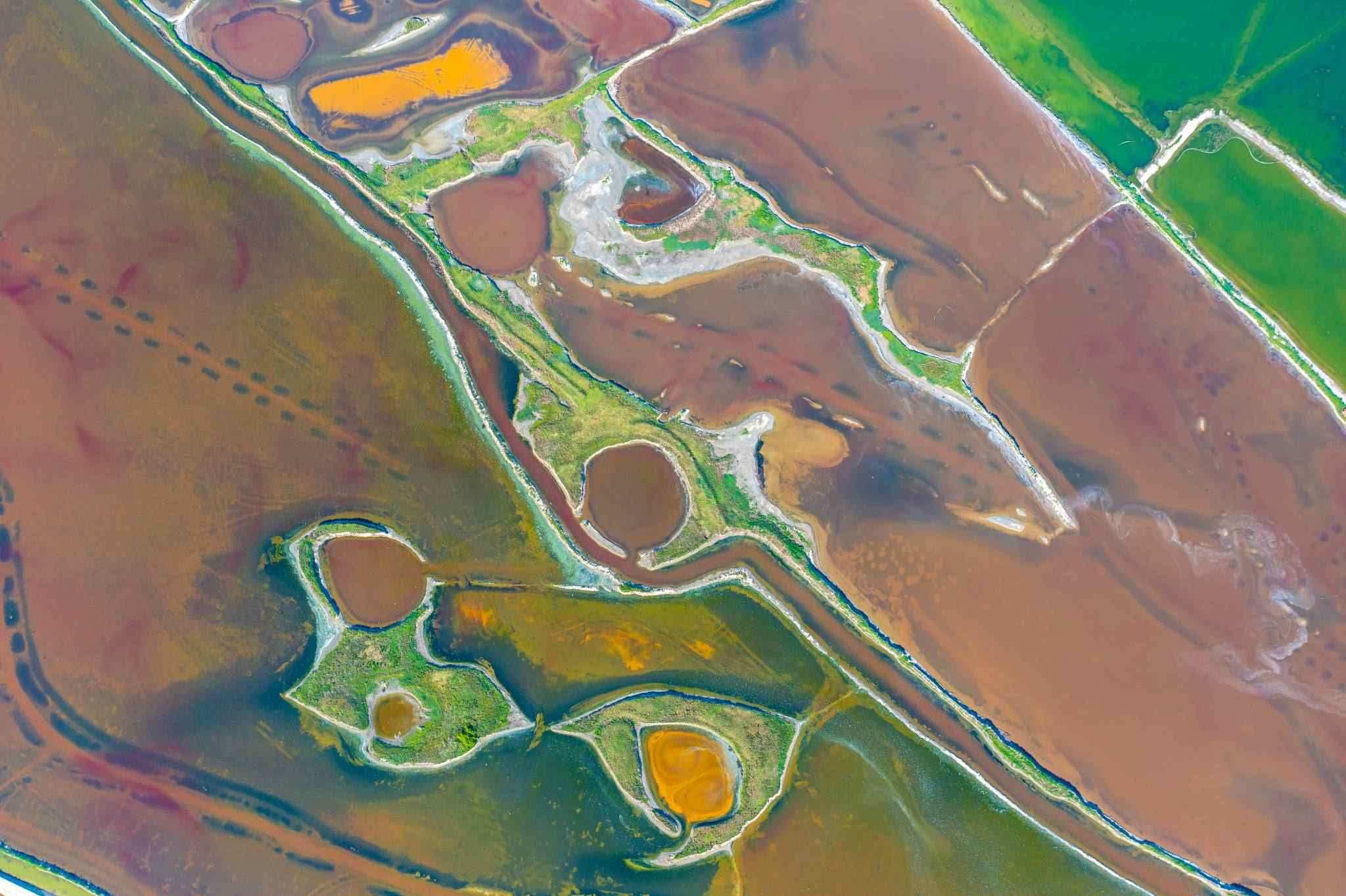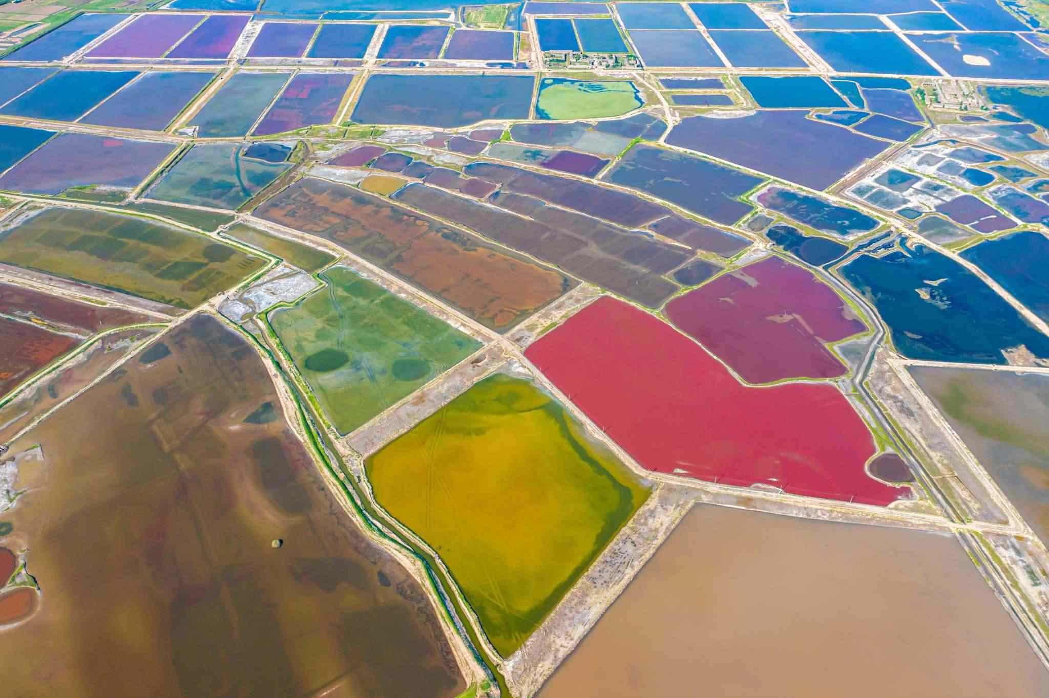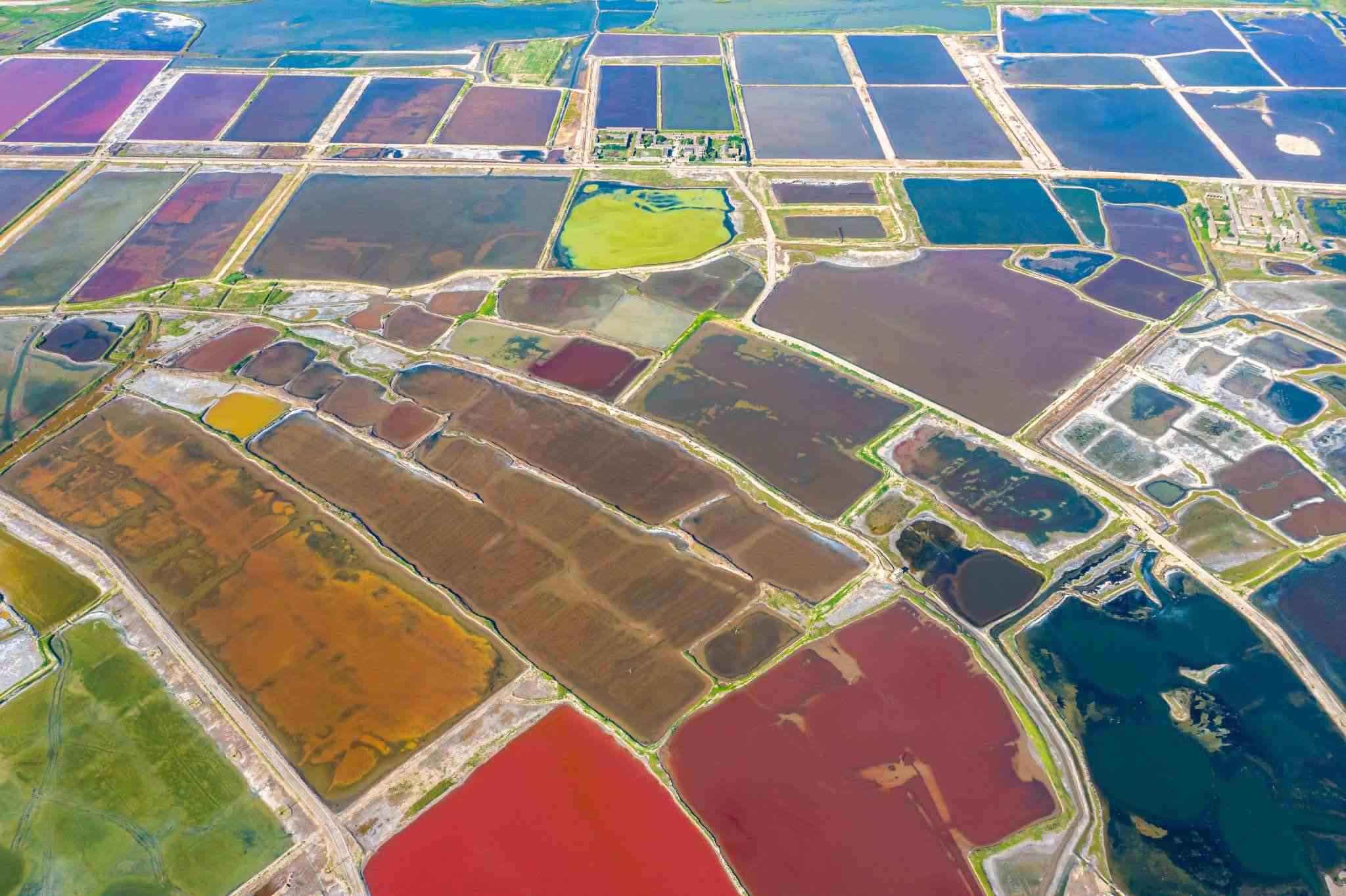 2023年6月14日,山西運(yùn)城,七彩鹽湖呈現(xiàn)出色彩斑斕的景觀,猶如大地調(diào)色板,美不勝收。視覺中國
