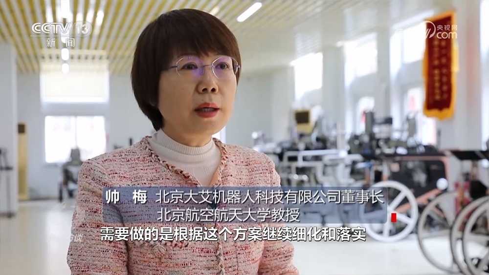 北京大艾機(jī)器人科技有限公司董事長(zhǎng)、北京航空航天大學(xué)教授帥梅:“就是通過(guò)外骨骼機(jī)器人訓(xùn)練,來(lái)給他建立正確的行走模式,以及正確的本體感覺,讓他能重新行走?!?/p>