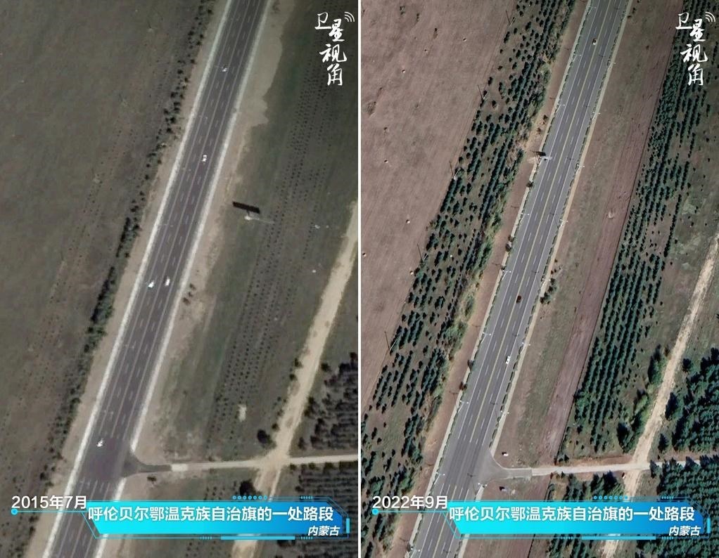 ↑2022年與2015年相比,內(nèi)蒙古呼倫貝爾鄂溫克族自治旗一處道路兩側(cè)樹(shù)木顯著增多。