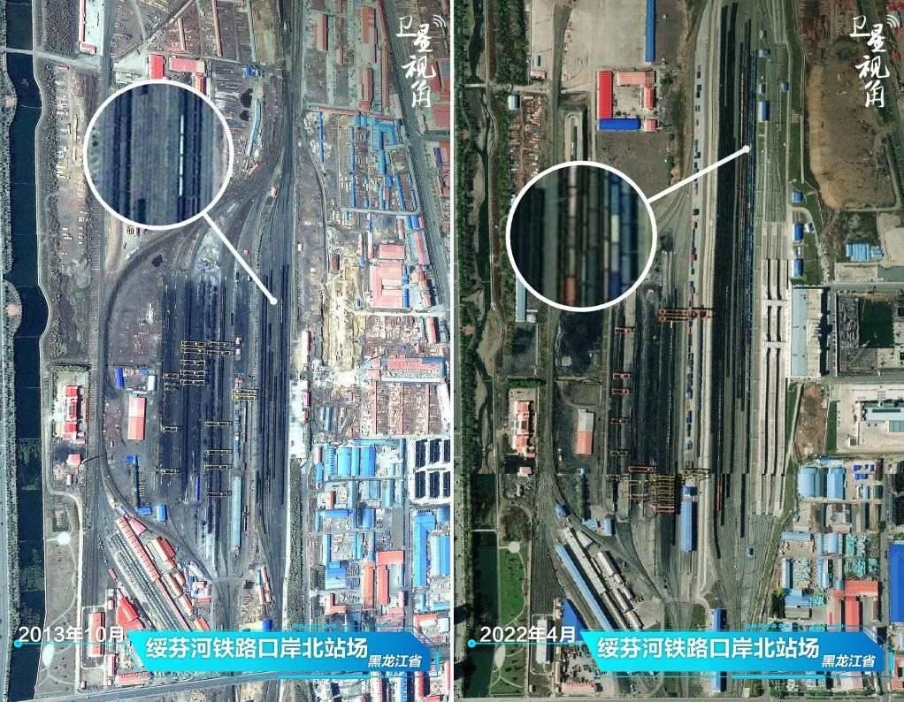 ↑2022年與2013年相比,綏芬河鐵路口岸貨運(yùn)列車(chē)增多,反映外貿(mào)活力增強(qiáng)。