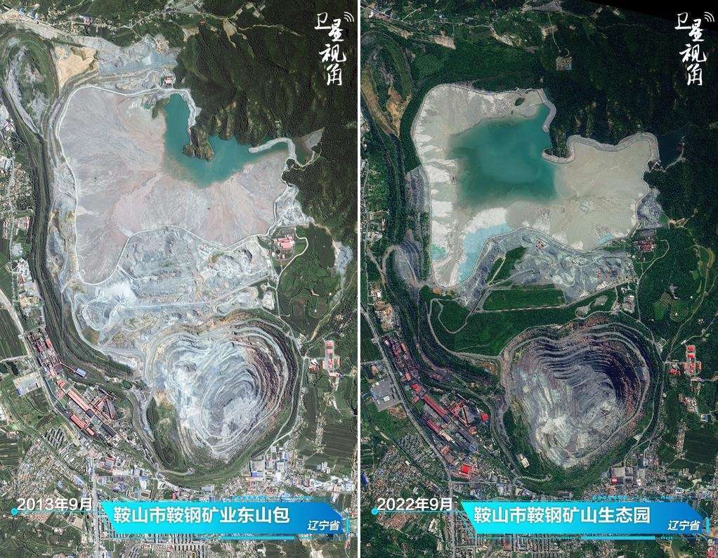 ↑2022年與2013年相比,曾經(jīng)塵土飛揚(yáng)的鞍鋼礦山,如今蛻變?yōu)闈M(mǎn)眼綠意的生態(tài)園。