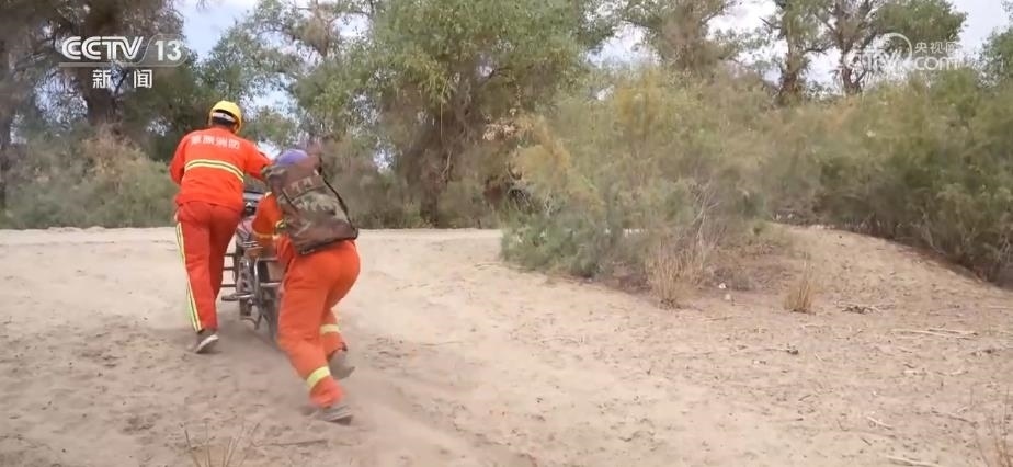 因為管護面積大,中午護林員只能用攜帶的干糧充饑。為了近距離查看胡楊樹的情況,他們大多數(shù)時候要在林中小路里穿梭。有的地方路況不好,就需要推著摩托車行走,難免遇到連人帶車陷進沙地里的情況,要格外小心。