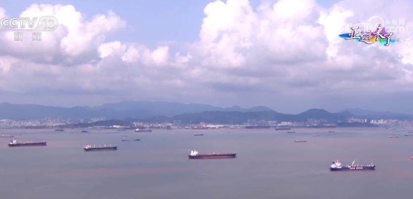 我們飛越兩座亞運(yùn)場(chǎng)館,將要看到的就是寧波最閃亮的名片之一:寧波舟山港。繁忙是這座港口的常態(tài)。當(dāng)我們的直升機(jī)遠(yuǎn)遠(yuǎn)地飛行,還沒(méi)有靠近港口的時(shí)候,就能先看到港口外的這片海域——洋小貓水域,這里是船舶經(jīng)南航道進(jìn)出寧波舟山港核心港區(qū)的一條必經(jīng)之路。向下看,大家可以看到海面上星星點(diǎn)點(diǎn)的船只,來(lái)自全球各地滿載商品貨物的遠(yuǎn)洋船舶在這里交匯。