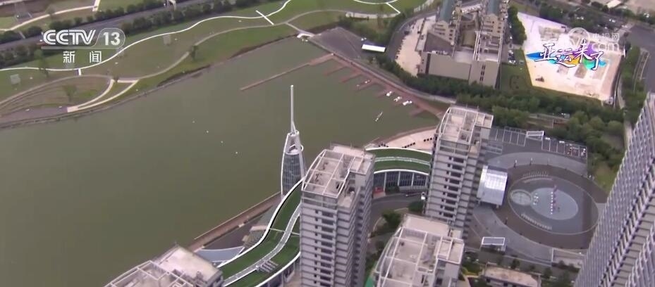 總臺記者 梁燁:但是要說溫州什么運動最熱鬧,那就肯定是龍舟了。我們現(xiàn)在看到的是溫州龍舟運動中心,這里是全亞洲最高標(biāo)準的龍舟賽場。我們從空中俯瞰,整棟樓看起來非常狹長,并且高低起伏猶如山脈,就好像是一條龍靜臥在水面之上,因此,這幢樓也被稱為“龍樓”。比賽時,這里主要作賽事保障用途。緊挨著龍樓的這座,從正面看像是船槳,從側(cè)面看像龍舟的建筑就是舟塔,這也是比賽的終點塔。比賽期間,裁判員們就會在這里觀看比賽,在這里計時計分。此時此刻,我們看到水面上正在進行演練,他們所劃行的這1200米的賽道到時候就是龍舟的比賽場地。