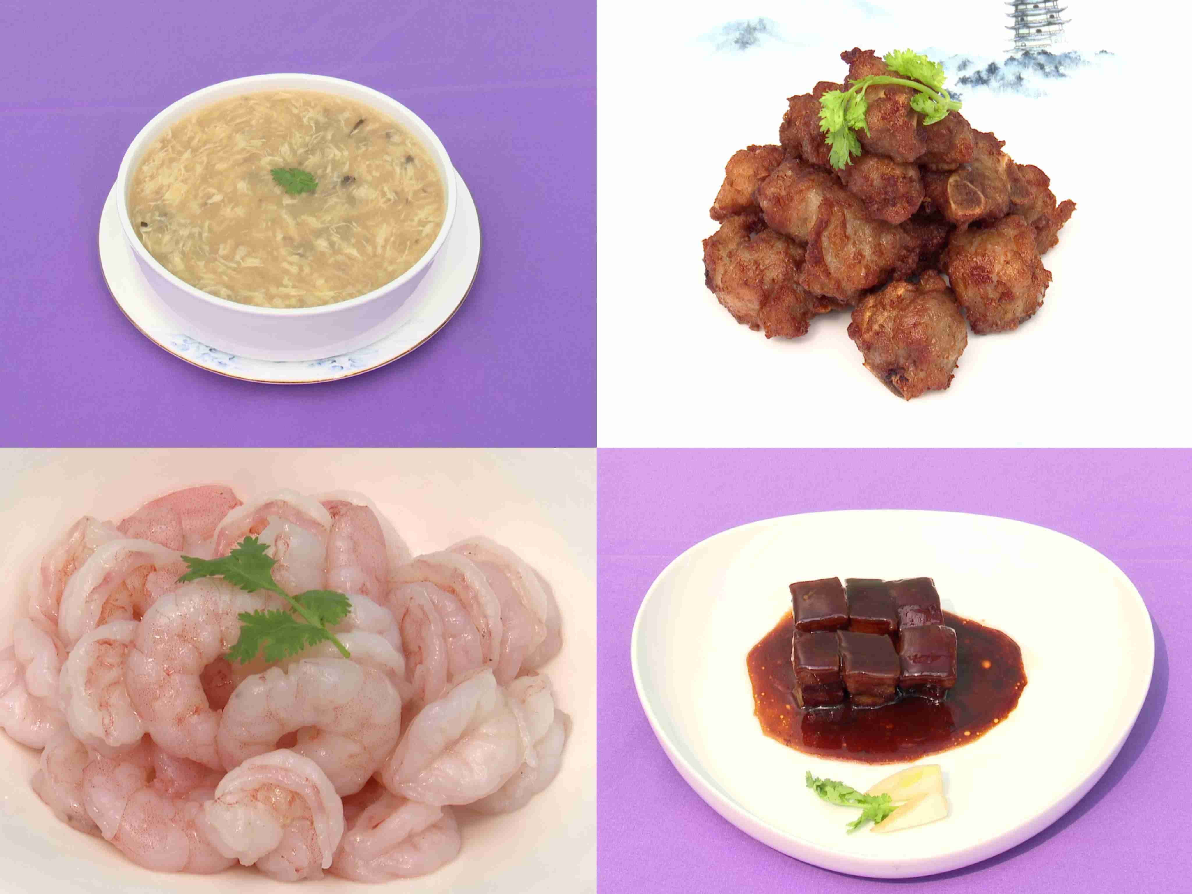 △左上:宋嫂魚羹;右上:蒜香肋排;左下:清炒蝦仁;右下:東坡肉。