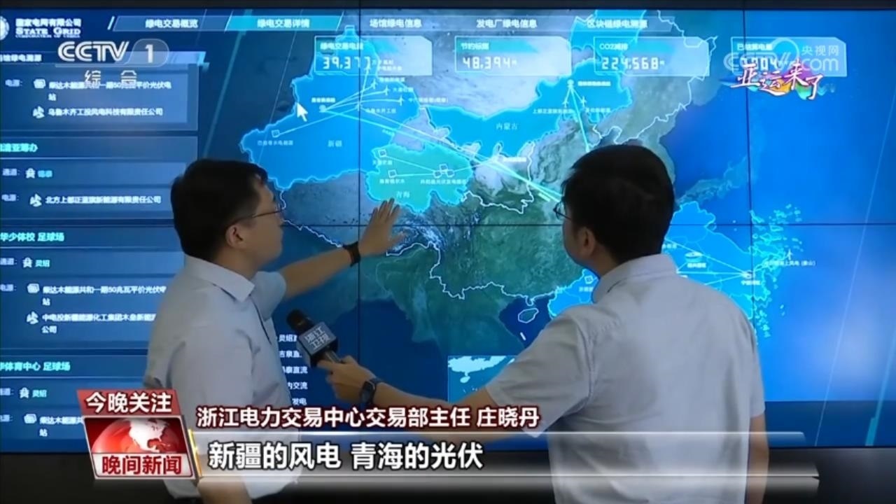 浙江電力交易中心交易部主任 莊曉丹:新疆的風(fēng)電、青海的光伏以及內(nèi)蒙古的風(fēng)電,分別通過(guò)三條特高壓直流線路,向浙江提供綠色電力供應(yīng)。