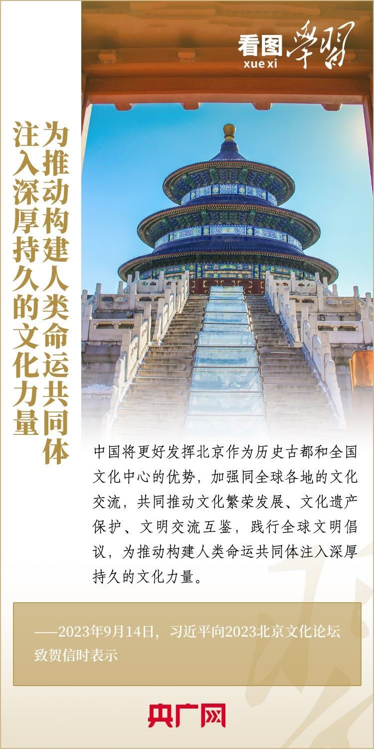 9月14日,以“傳承優(yōu)秀文化 促進交流合作”為年度主題的2023北京文化論壇在北京開幕。習近平主席向論壇致賀信表示,中國將更好發(fā)揮北京作為歷史古都和全國文化中心的優(yōu)勢,加強同全球各地的文化交流,共同推動文化繁榮發(fā)展、文化遺產保護、文明交流互鑒,踐行全球文明倡議,為推動構建人類命運共同體注入深厚持久的文化力量。