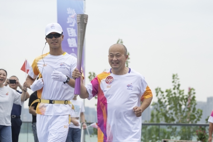 第1棒火炬手陳雨菲和第二棒火炬手、西湖大學(xué)校長施一公進(jìn)行火炬交接