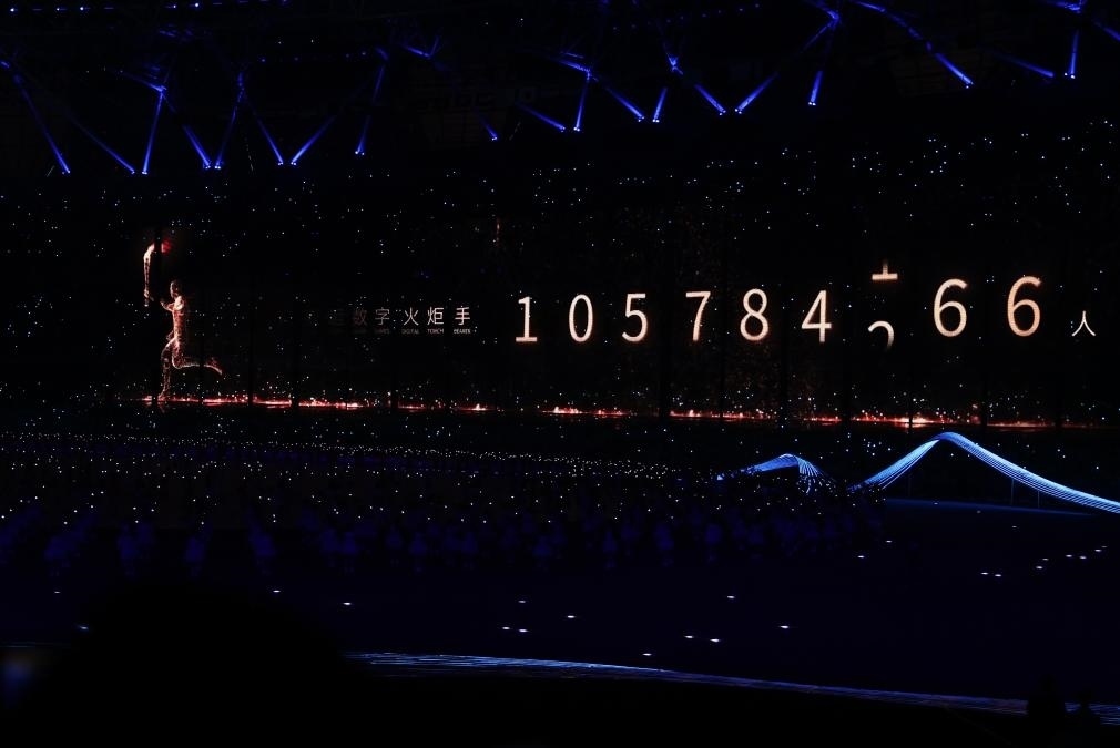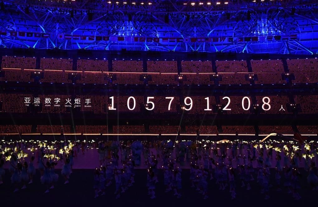 這是9月23日拍攝的開幕式現(xiàn)場顯示的亞運數(shù)字火炬手人數(shù)。新華社記者黃宗治攝