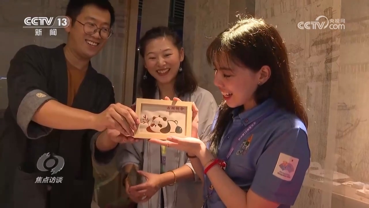 村里的文化市集里同樣熱鬧非凡,竹編、剪紙、皮影戲……每一個展位面前都圍著不少外國運(yùn)動員。來自泰國的擊劍運(yùn)動員正在體驗(yàn)綢傘刷花。在刷子涂上顏料,再和絲網(wǎng)進(jìn)行充分摩擦,顏料就會透過刻板平鋪在畫布上,精美的熊貓圖案就做出來了。當(dāng)?shù)弥@是綢傘上的技術(shù)時(shí),運(yùn)動員班提達(dá)十分驚訝。