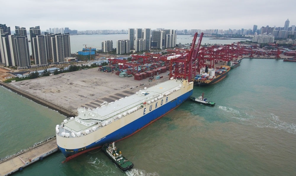 2020年2月16日,滾裝貨船“勞拉”輪駛?cè)牒?谛阌⒏郏o人機照片)。這是海南自貿(mào)區(qū)政策實施后的首艘汽車外貿(mào)船。新華社記者 楊冠宇 攝