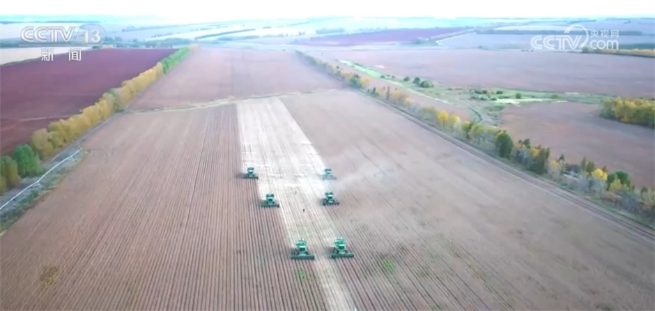 您現(xiàn)在看到的是黑龍江墾區(qū)鶴山農場的大豆“高產攻關”示范田,眼下正是大豆收獲的高產期,農場每天出動52臺收獲機,節(jié)糧減損,確保豐收的糧食顆粒歸倉。