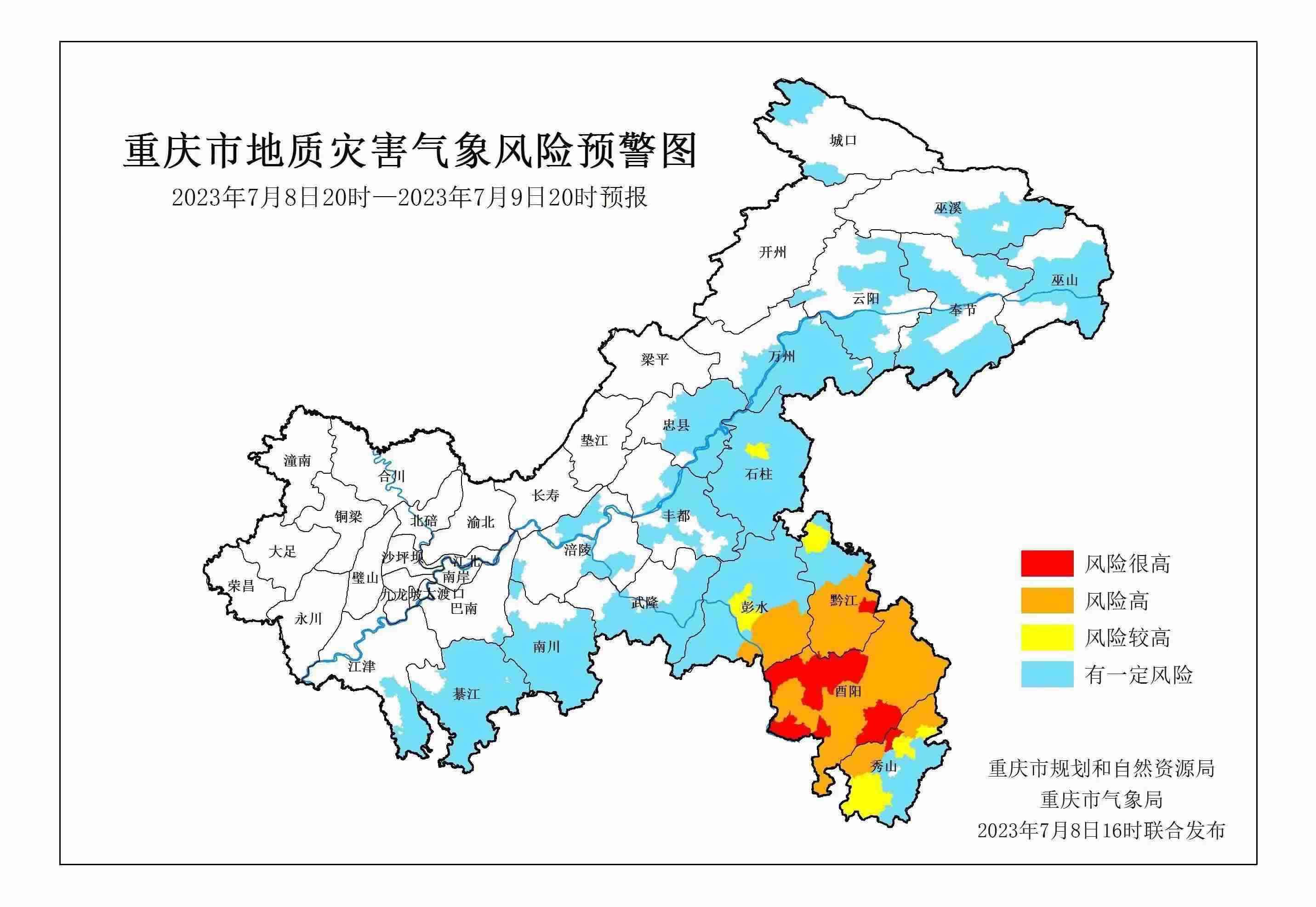 7月8日16時(shí),重慶市規(guī)劃和自然資源局、重慶市氣象局聯(lián)合發(fā)布全市地質(zhì)災(zāi)害氣象風(fēng)險(xiǎn)預(yù)警。