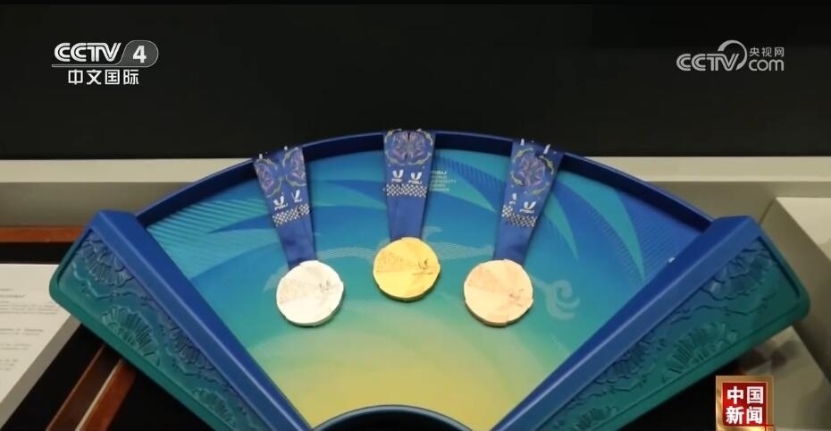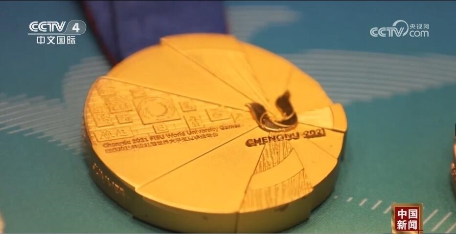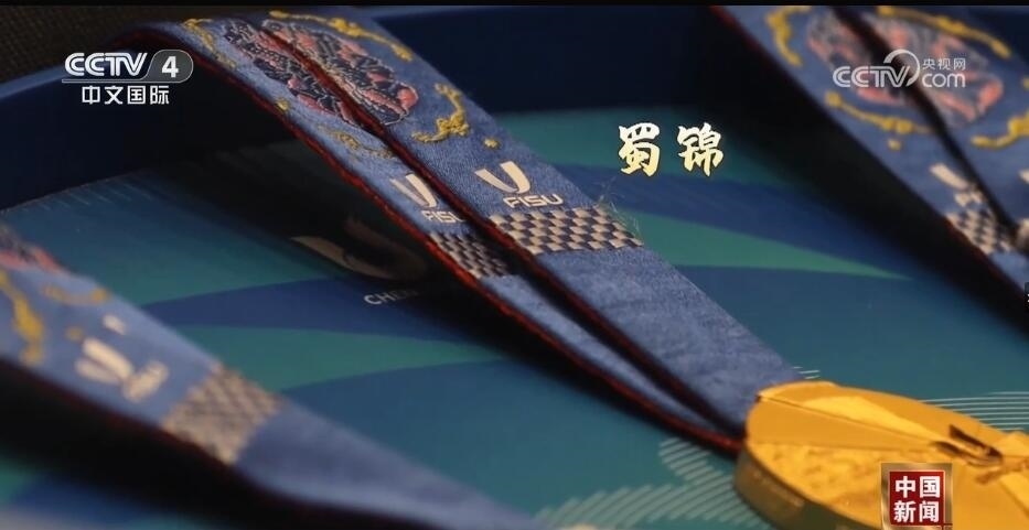 總臺(tái)記者 王豐:走進(jìn)成都大運(yùn)會(huì)博物館,最大的感受就是成都的元素?zé)o處不在。比如,我們剛一進(jìn)來,右手邊是成都大運(yùn)會(huì)的吉祥物蓉寶。看完蓉寶帶您來看看蓉光,什么是蓉光呢?獎(jiǎng)牌代表了成都大運(yùn)會(huì)的榮譽(yù),“蓉”是取自成都的簡稱,包含了光榮和融合的含義,整個(gè)獎(jiǎng)牌的設(shè)計(jì)是呈現(xiàn)了不規(guī)則的圓形。另外,獎(jiǎng)牌的元素包含成都市的標(biāo)志——太陽神鳥。此外,在獎(jiǎng)牌的綬帶設(shè)計(jì)上首次采用了蜀錦的制作工藝,實(shí)際上也是非物質(zhì)文化遺產(chǎn)活化利用的非常好的案例。