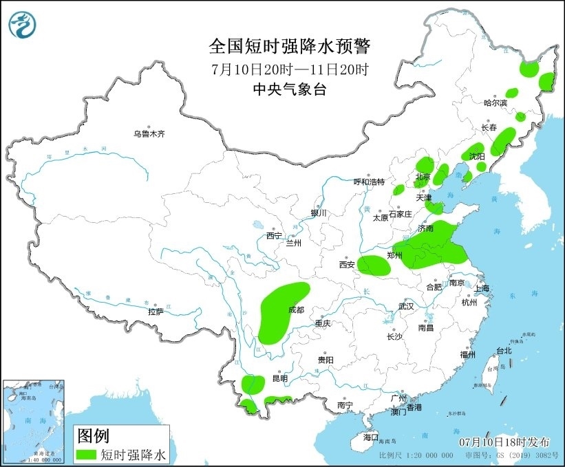 中央氣象臺7月10日18時繼續(xù)發(fā)布強對流天氣藍色預警