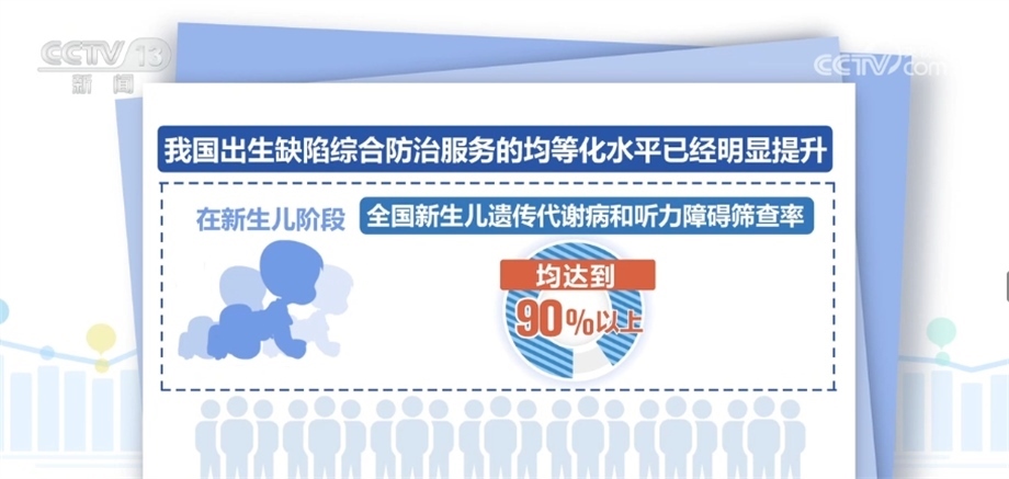 2009年以來,累計為1.3億名農(nóng)村生育婦女補服葉酸;全國婚檢率從2011年的41.9%提高至2021年的70.9%;全國產(chǎn)前篩查率從2011年的22.7%提高至2021年的85.7%;全國新生兒遺傳代謝病和聽力障礙篩查率均達(dá)到90%以上。建立起出生缺陷三級防治體系。