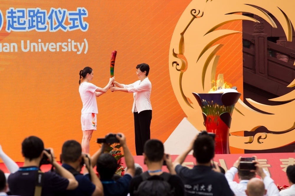 7月2日,第一棒火炬手吳敏霞(左)接過點燃的火炬。當日,成都第31屆世界大學生夏季運動會火炬?zhèn)鬟f成都站起跑儀式在四川大學校園內(nèi)舉行。新華社發(fā)(曹鵬攝)