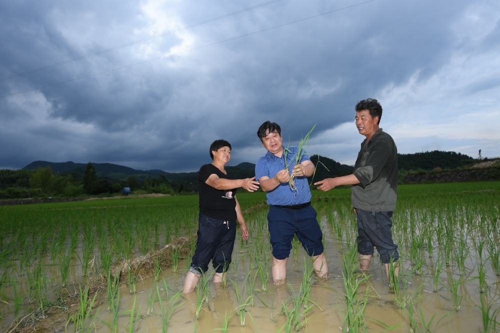 在浙江省仙居縣廣度鄉(xiāng)西角村,浙江大學(xué)環(huán)境與資源學(xué)院教授吳良?xì)g(中)在省級科研試驗(yàn)田里指導(dǎo)農(nóng)戶進(jìn)行水稻種植(7月4日攝)。新華社記者 翁忻旸 攝