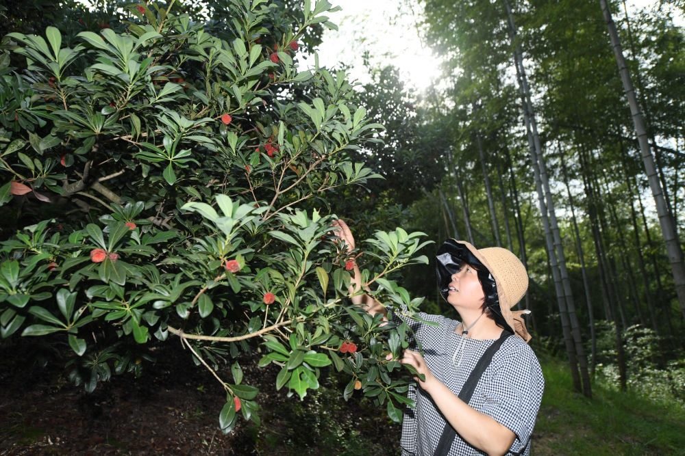 在浙江省仙居縣廣度鄉(xiāng)瓦垚頭村,浙江大學(xué)環(huán)境與資源學(xué)院教授吳良?xì)g結(jié)對指導(dǎo)的村民鄭文娟在查看楊梅長勢(7月4日攝)。新華社記者 翁忻旸 攝