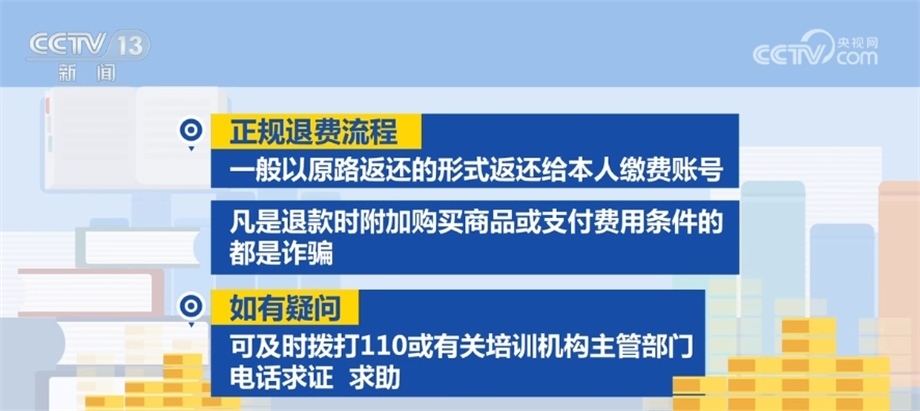 正規(guī)退費(fèi)流程一般以原路返還的形式返還給本人繳費(fèi)賬號(hào),凡是退款時(shí)附加購(gòu)買商品或支付費(fèi)用條件的都是詐騙。如有疑問,可及時(shí)撥打110或有關(guān)培訓(xùn)機(jī)構(gòu)主管部門電話求證、求助。