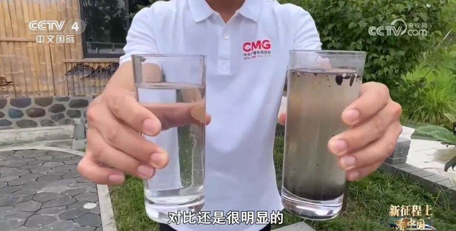 記者:這里是湖水。你看,這兩個杯子(里的水)處理之前跟處理之后對比還是很明顯的。