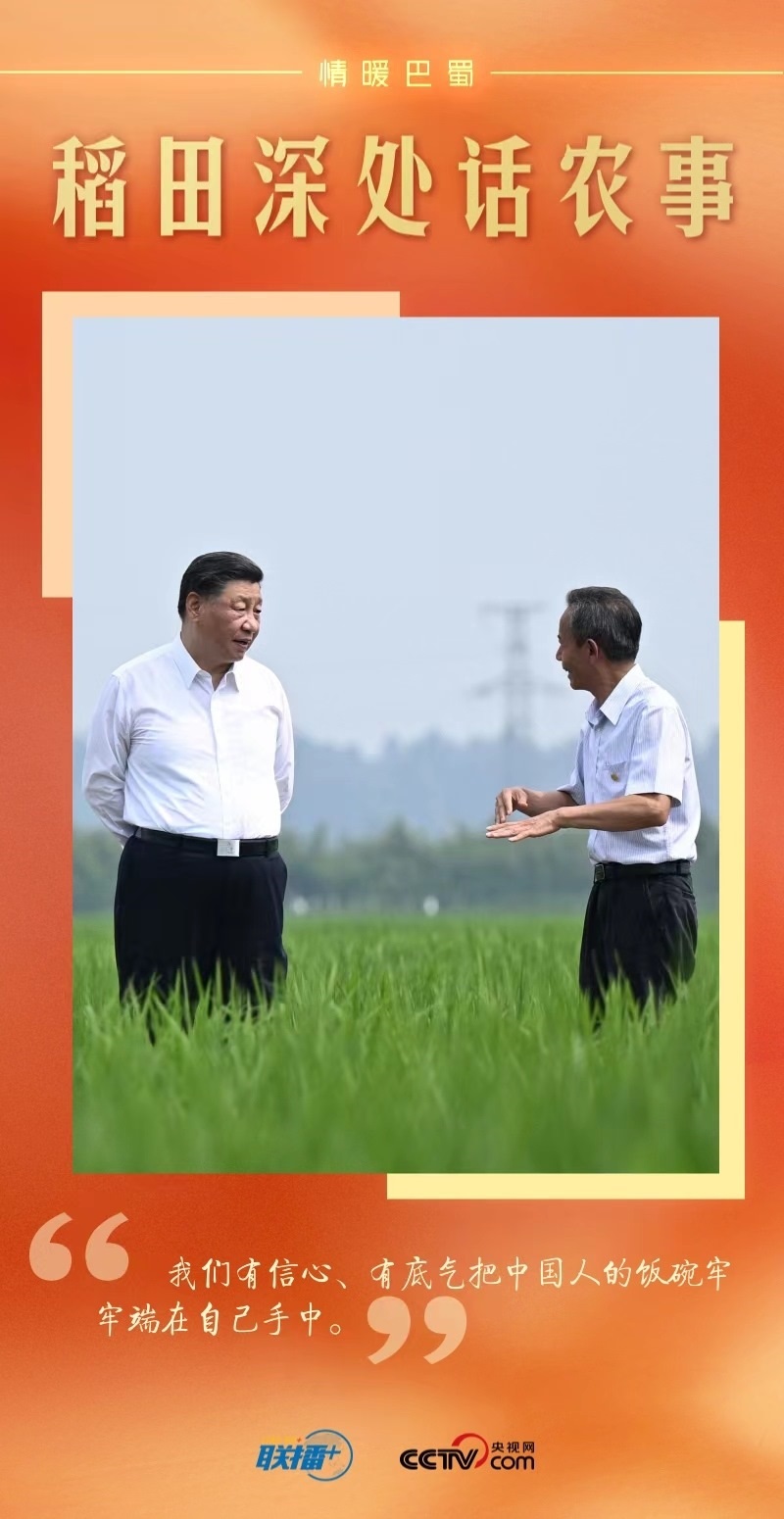 遠眺廣袤田野,總書記思慮深遠:“民以食為天。推進農(nóng)業(yè)現(xiàn)代化,既要靠我們中國的農(nóng)業(yè)專家,也要靠我們中國的農(nóng)民,我們有信心、有底氣實現(xiàn)糧食安全的目標。四川要把農(nóng)業(yè)搞好,把糧食生產(chǎn)抓好?!?/p>
