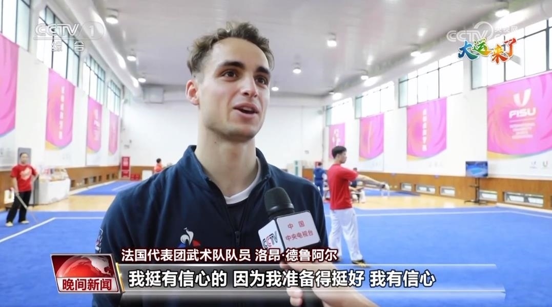 法國代表團武術(shù)隊隊員 洛昂·德魯阿爾:我要比賽的項目是長拳和棍術(shù)。我每天都會訓(xùn)練,一天一般訓(xùn)練兩次。我挺有信心的,因為我準備得挺好,我有信心。?