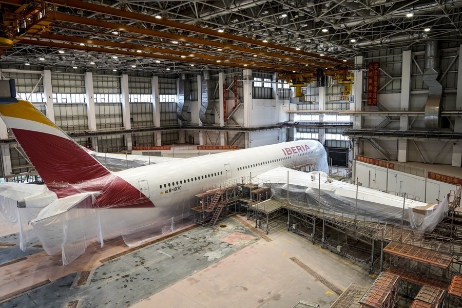 5月11日,噴涂作業(yè)員對空客A350-900寬體客機進行打磨除漆。新華社記者 張麗蕓 攝