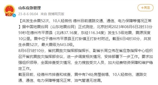央視網(wǎng)消息:據(jù)@山東應急管理 消息,據(jù)中國地震臺網(wǎng)(山東地震臺網(wǎng))正式測定,北京時間2023年08月6日2時33分59秒在德州市平原縣(北緯37.16度,東經(jīng)116.34度)發(fā)生5.5級地震,震源深度10公里。震中位于德州市平原縣王打卦鎮(zhèn)王打卦村附近。截至6日4時30分,共發(fā)生余震52次,最大震級為M3.0級。