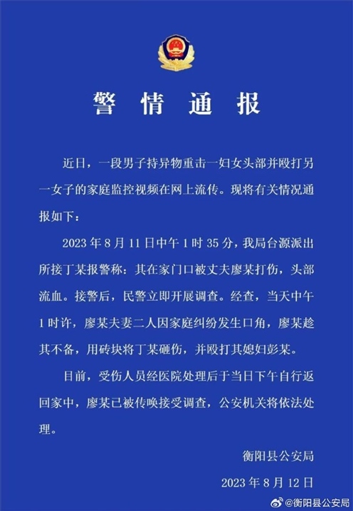 ·男子持磚砸傷妻子并毆打兒媳,湖南衡陽警方通報:依法處理。