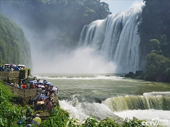 8月11日,貴州安順,游客在黃果樹瀑布景區(qū)游覽。暑期以來,黃果樹風(fēng)景區(qū)瀑布水勢磅礴、飛瀉而下,進入最佳觀賞季。