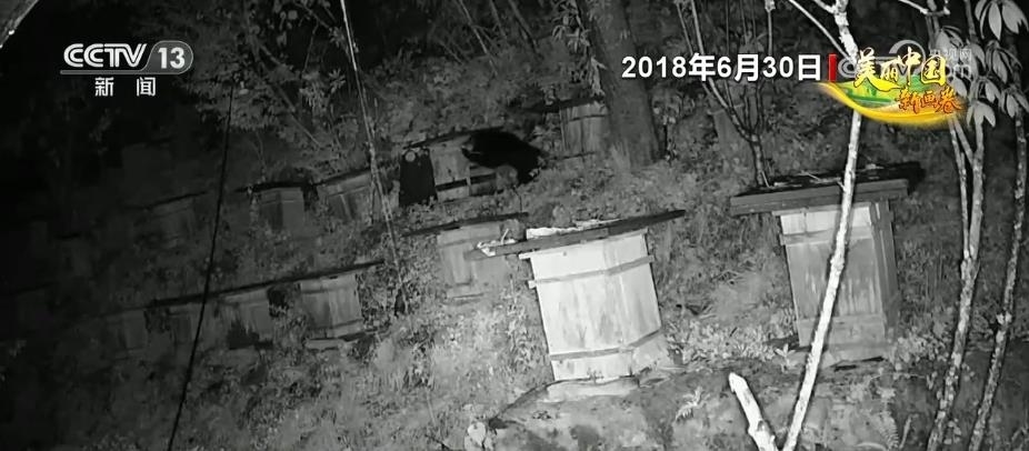 在湖北堵河源國(guó)家級(jí)自然保護(hù)區(qū),經(jīng)常會(huì)發(fā)生黑熊下山偷食百姓的莊稼、蜂蜜等農(nóng)產(chǎn)品。記者通過(guò)當(dāng)?shù)匾晃淮迕裉峁┑囊曨l看到,2018年晚上一頭成年黑熊來(lái)到一蜂箱放置點(diǎn),黑熊為了取食蜂蜜推倒了一箱蜂箱,并啃食了幾口蜂蜜。