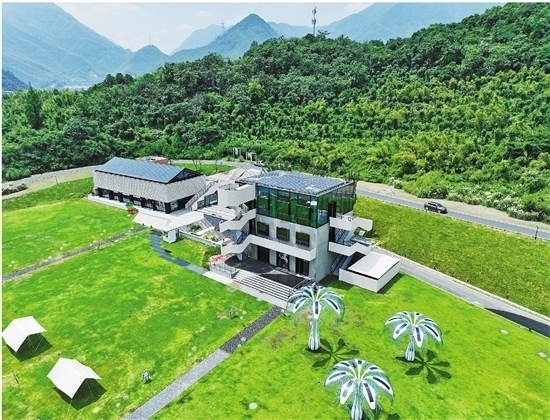 圖為余村未來圖書館,該建筑主要通過鋪設(shè)在屋頂上的光伏發(fā)電系統(tǒng)和“光伏樹”供電(無人機照片)。新華社記者 翁忻旸 攝